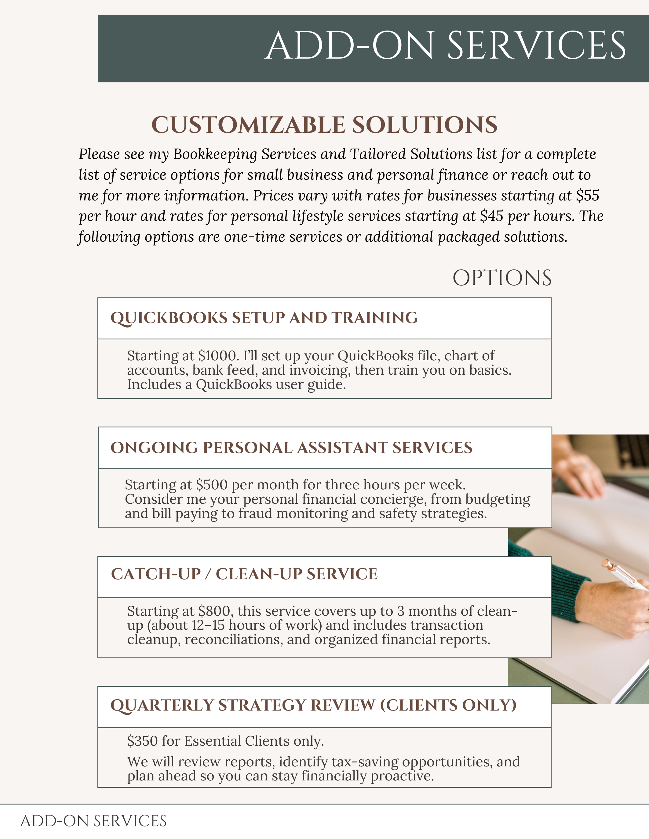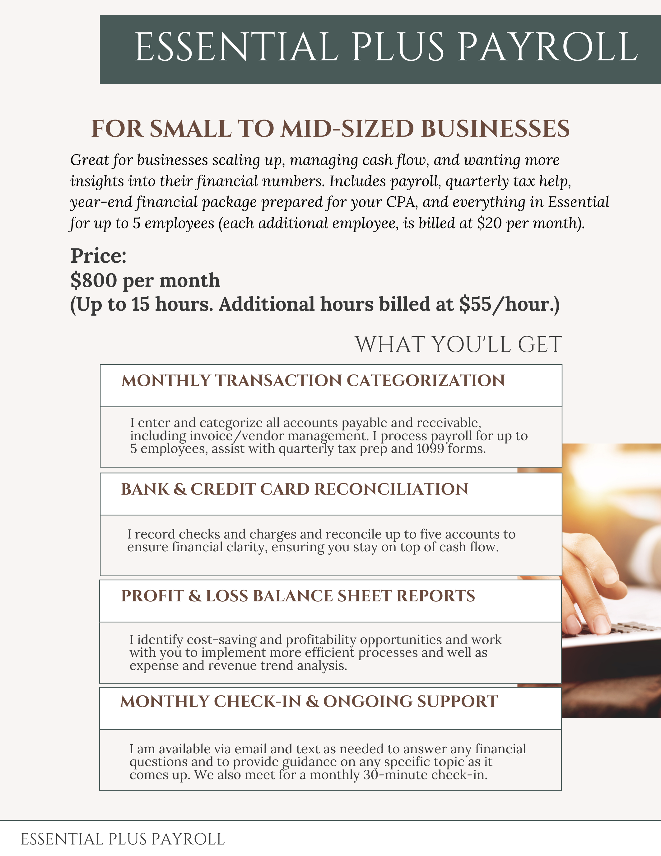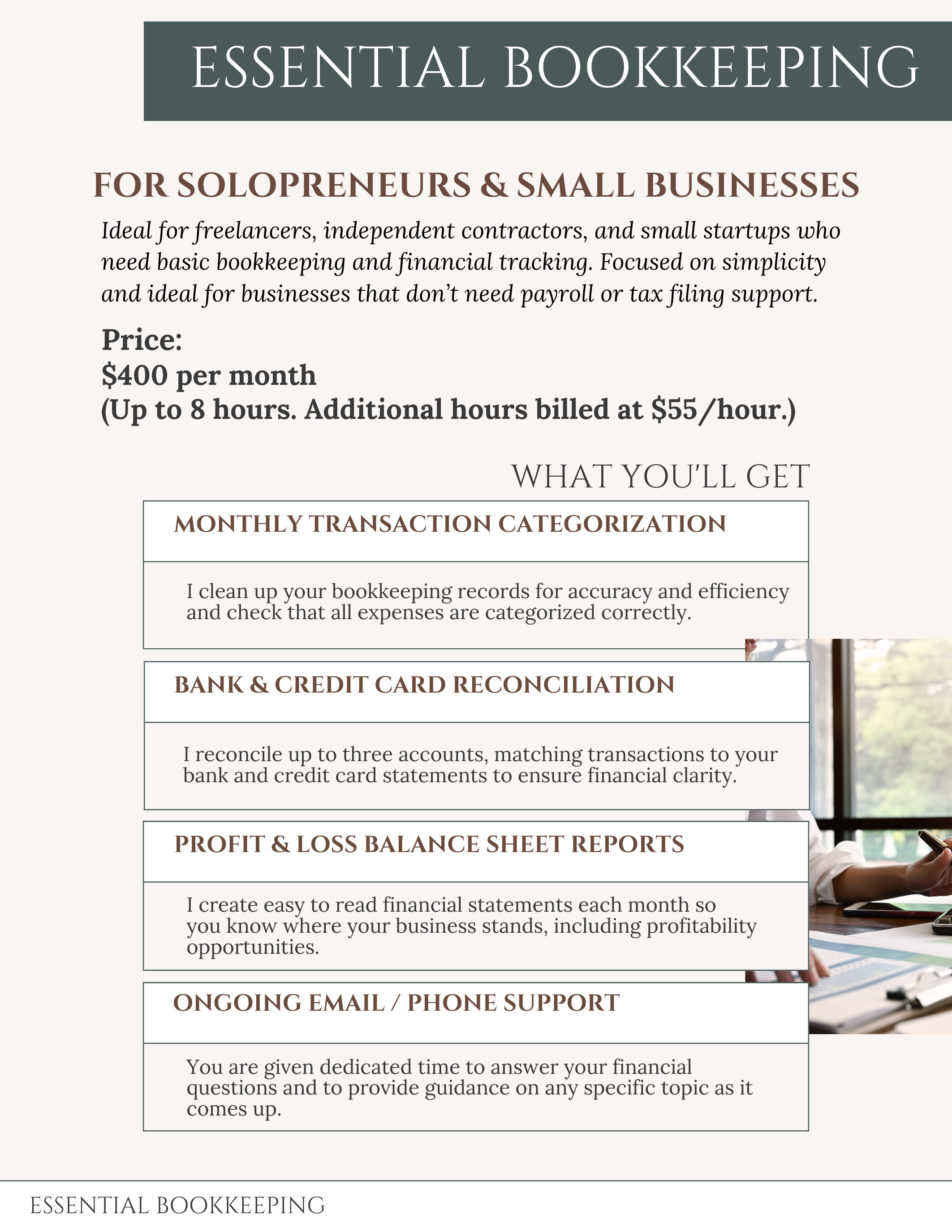 The endless pieces of business ownership can feel overwhelming. Even just a few days a month with my bookkeeping service will help you take control.